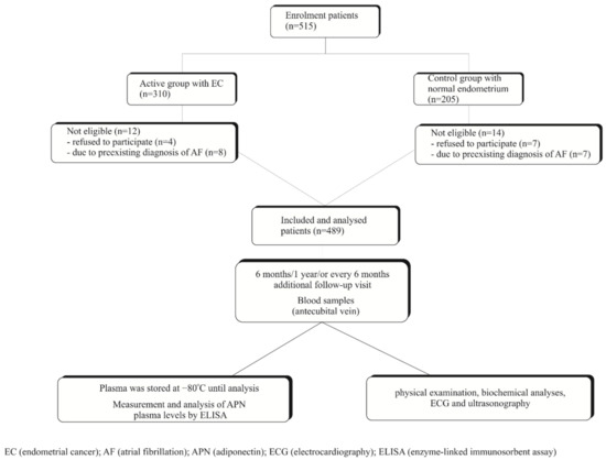 In conclusion, the present results suggest that postmenopausal women with EC carry an increased risk of AF, compared with the general population with non-cancerous (normal and/or hyperplastic) endometrium. Furthermore, serum APN plays an important role in the development of obesity-related EC. Nevertheless, increased awareness of early signs of AF is warranted among EC patients to attain earlier diagnosis and treatment, since the risk remains increased several months after the EC diagnosis. Furthermore, the cardiac risk profile should be drawn up and close monitoring should be carried out during survivorship [24,34]. It is deemed necessary to clarify the role of obesity in endometrial carcinogenesis, developing a strategy to combat obesity and the development of a non-invasive diagnostic test to evaluate the risk of AF in postmenopausal women with EC.