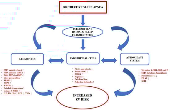 The resulting imbalance between oxidative stress from increased oxygen free radicals and an ineffective antioxidant capacity can be quantified through various inflammatory biomarkers, molecules generated by the oxidation of nucleic acids, proteins and lipids and expression of multilevel cell damage [22,23,24,25,26]. On the other hand, increased ROS production resulting from the hypoxia/reoxygenation cycles can increase cytokines and adhesion molecules’ expression linked to endothelial dysfunction and cardiovascular disease.