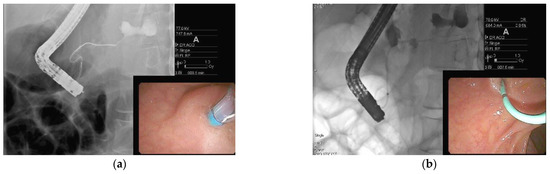 DDS first came to light in the 1990s, but its prevalence was initially underestimated given that it was best diagnosed with ERP and had no radiologic diagnostic criteria [50]. Maatman et al. performed the largest retrospective review of patients with necrotizing pancreatitis (n = 647) and found a DDS prevalence of 36%. DDS was associated with worse outcomes and increased rates of PFC recurrence [51]. While surgery has long been the cornerstone of DDS management, advances in endoscopy have provided minimally invasive alternatives that will likely minimize the role of surgical intervention in the future. Endoscopic management of DDS includes transpapillary drainage (Figure 6), which involves placing a plastic stent into the main pancreatic duct to allow the pancreatic juices to flow into the duodenum [52]. Jang et al. found transpapillary drainage alone was 92% effective in partial pancreatic duct disruptions, but only 20% effective in complete pancreatic duct disruptions. In addition, patients with complete pancreatic duct disruptions were more likely to undergo surgical management [49].