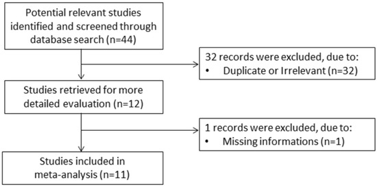 A flow chart describing the screening process is presented in Figure 1. We initially identified 44 studies. A total of 32 studies were excluded because they were either duplicates or irrelevant. After a full-text review of the remaining 12 articles, one further study was excluded because of missing information. Thus, 11 studies were included in the meta-analysis [30,31,32,33,34,35,36,37,38,39,40]. Their characteristics are presented in Table 1. A total of 4901 COVID-19 patients were studied, 4247 (50% males, mean age 52 years) with low severity or who survived and 654 (57% males, mean age 66 years) with high severity or who died. Two studies were prospective [34,36], while the remaining nine were retrospective [30,31,32,33,35,37,38,39,40]. Six studies were performed in Asia [30,33,35,38,39,40], three in Europe [32,36,37], and two in America [31,34]. End points included disease severity based on current clinical guidelines in six studies [30,33,34,35,39,40], survival in three [31,36,37], and transfer to ICU in two [32,38].