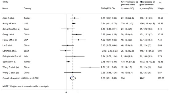 The RDW, a parameter reported in the vast majority of standard hematological tests performed in primary care and hospital settings across the globe, reflects the degree of heterogeneity of the volume of red blood cells. The presence of a relatively high degree of heterogeneity is known as anisocytosis [11]. The RDW is typically calculated as the standard deviation of the volume of red blood cells divided by their mean corpuscular volume. The obtained value is then multiplied by 100, which leads to the final RDW value, expressed as a percentage [10,11]. While RDW values below the normal range are extremely rare in clinical practice, and of dubious significance, values above this range are commonly observed in a number of physiological and pathological states [10,12]. Furthermore, and perhaps more importantly, higher RDW values have been shown to independently predict adverse clinical outcomes in systematic reviews and meta-analyses focusing on specific disease states, particularly hematological malignancies, solid cancers, heart failure, ischemic heart disease, stroke, critical illness, and sepsis [13,14,15,16,17,18,19]. However, it is not possible to compare the effect size between our meta-analysis and these studies as the results in the latter were expressed as risk ratio, odds ratio, or hazard ratio. Therefore, while the available evidence suggests that higher RDW values represent a non-specific marker of disease, which likely reflects alterations in red blood cell turnover in response to an excess production of other cells in the bone marrow in the context of systemic inflammation, this parameter might assist in management decisions in hospitalized patients with COVID-19, a relatively new and potentially lethal viral disease with limited therapeutic options. For example, higher RDW values on admission might help identify those patients that are more at risk of developing severe clinical manifestations, potentially requiring intensive monitoring and early transfer to an ICU setting. This might provide a number of benefits in terms of patient outcomes, length of stay, and resource allocation, particularly in situations of high patient load and staff shortages.