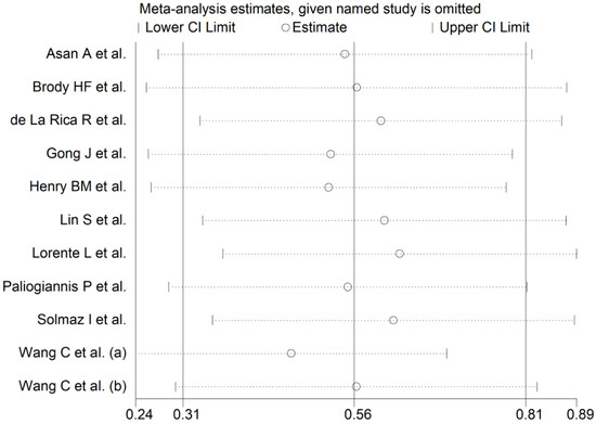 - Tobias, A. Assessing the influence of a single study in the meta-analysis estimate. Stata Tech. Bull. 1999, 47, 15–17. [Google Scholar]