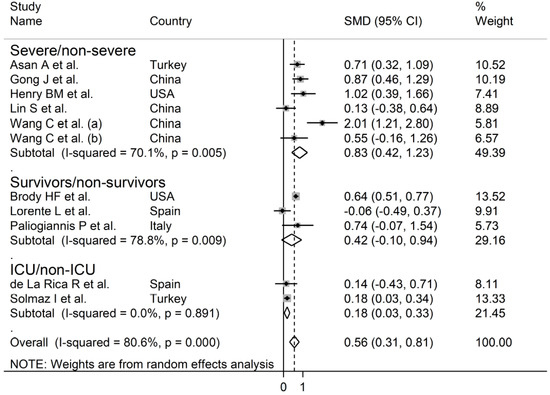 Standardized mean differences (SMD) were used to build forest plots of continuous data and to evaluate differences in RDW values between COVID-19 patients with low vs. high disease severity or survivor vs. non-survivor status. A p-value < 0.05 was considered statistically significant, and 95% confidence intervals (CIs) were reported. When RDW values were reported as median and interquartile range (IQR), the mean and standard deviation were derived as previously described [22]. The Q-statistic was used to test the between-study heterogeneity in SMD values (the significance level was set at p < 0.10). Inconsistency across studies was evaluated through the I2 statistic (I2 < 25%, no heterogeneity; I2 between 25% and 50%, moderate heterogeneity; I2 between 50% and 75%, large heterogeneity; and I2 > 75%, extreme heterogeneity) [23,24]. A random-effects model was used, in the presence of a high heterogeneity, to calculate the pooled SMD values and the corresponding 95% confidence intervals. The influence of each individual study on the overall effect size estimate was investigated using sensitivity analysis, by sequentially excluding one study at a time [25]. The associations between study size and magnitude of effect were analyzed using the Begg’s adjusted rank correlation test and the Egger’s regression asymmetry test, at the p < 0.05 level of significance, to assess the presence of potential publication bias [26,27]. The Duval and Tweedie “trim and fill” procedure was used to further test the possible effect of publication bias [28]. This method recalculates a pooled SMD by incorporating the hypothetical missing studies as though they actually existed, to augment the observed data so that the funnel plot is more symmetric. Statistical analyses were performed using Stata 14 (STATA Corp., College Station, TX, USA). The study was fully compliant with the PRISMA statement regarding the reporting of systematic reviews and meta-analyses [29].