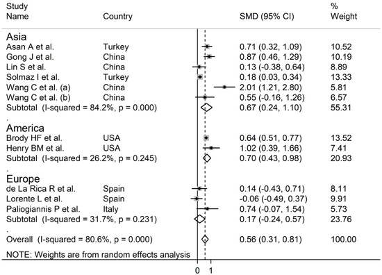 Forest plot of studies examining RDW values in patients with COVID-19 according to the geographic area where the study was conducted. The diamond represents the point estimate and confidence intervals after combining and averaging all the individual studies together. The vertical line through the vertical points of the diamond represents the point estimate of the averaged studies.