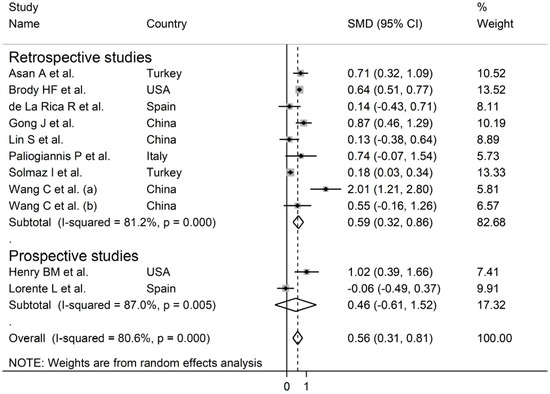 Forest plot of studies examining RDW values in patients with COVID-19 according to the study design (prospective vs. retrospective). The diamond represents the point estimate and confidence intervals after combining and averaging all the individual studies together. The vertical line through the vertical points of the diamond represents the point estimate of the averaged studies.