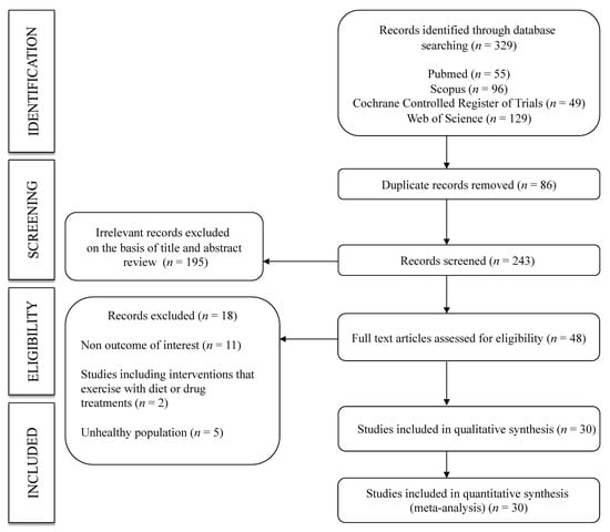 We excluded (i) reports on the effect of exercise measured 24 h after the intervention; (ii) review articles, editorials, or case reports; (iii) studies including interventions combining exercise with dietary or pharmacological treatments; (iv) reports of two exercise sessions in a study less than 48 h apart; (v) articles that were not written in English or Spanish.
