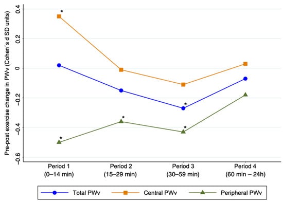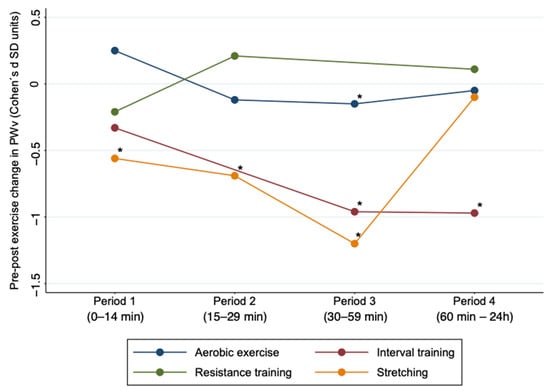 Acute effect of different types of exercise on pulse wave velocity by time period after exercise. PWv: pulse wave velocity; SD: standard deviation. * Values p < 0.05 were considered significant.