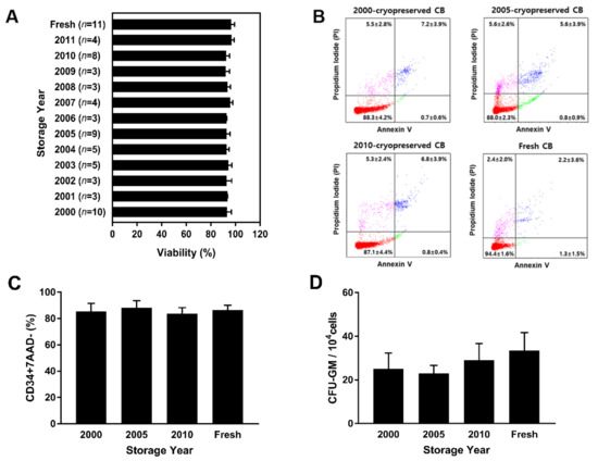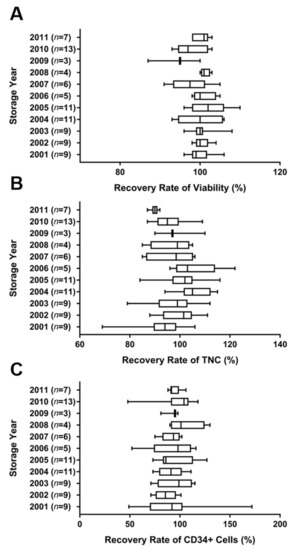 CB banking is increasingly performed for improving chances of potential future transplantation. According to previous reports, UCB contains approximately 10% less stem cells than bone marrow [8,9], but UCB contains similar numbers of progenitor cells (CD34+ cells) volume per volume with bone marrow. However, CB transplantation does not require an exact genetic match. Since the first successful transplantation of cord blood in 1988, quality issues in cord blood specimens have been addressed [10,11]. Therefore, the maintenance of the quality and viability of infused total nucleated cells (TNCs) or CD34+ cells is critical for successful transplantation, owing to retaining adequate cell numbers for future transplantation [12]. Typically, cord blood is processed by depleting red blood cells (RBCs) and plasma. After post-processing with programmable controlled freezing, the CB unit is transferred to a liquid nitrogen tank and stored at −196 °C. A previous report demonstrated over 90% recovery of hematopoietic progenitor cells from cryopreserved CB stored for more than 10–15 years [13].
