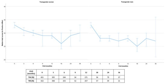 Prospective median total scores for positive affect over 36 months of follow-up (with error bars—95% confidence interval), subdivided by gender identity.