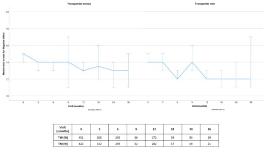 Prospective median total scores for negative affect over 36 months of follow-up (with error bars—95% confidence interval), subdivided by gender identity.