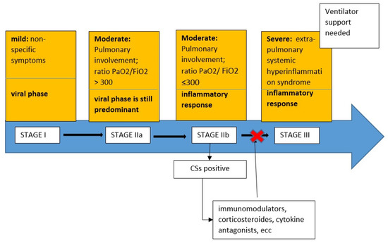 A recent clinical stage proposal categorized COVID-19 as Stage I (mild), Stage II (moderate) with pulmonary involvement without hypoxia (IIa) and with hypoxia (IIb); and Stage III—characterized by ARDS, with a progression, due to a gradual decrease in the virological phase and an increase in the inflammatory one [7].