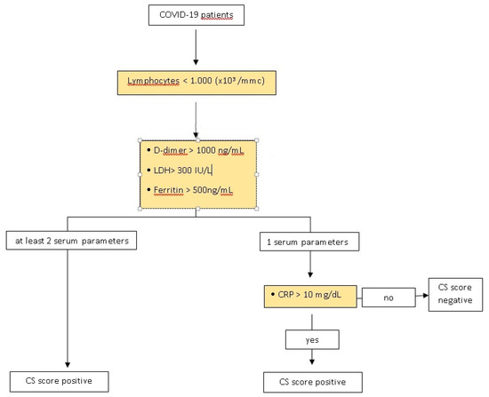 In patients with lymphopenia and derangement of only one of D-Dimer, ferritin, or LDH, then the C-reactive protein (CRP) was measured. A CRP greater than 10 mg/dL was considered positive, and, together with lymphopenia, and derangement of D-Dimer, ferritin, or LDH, would result in a positive CSs (Table 1).