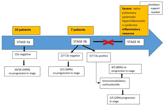 Five out of seven patients (71.4%) in Stage IIb had a positive CSs. Two out of five (40%) were treated with tocilizumab (8 mg/Kg on day 1, with a second administration after 12 h) plus corticosteroids (dexamethasone 20 mg/day for 5 days, then 10 mg/day for 5 days); three out of five (60%) only received corticosteroids.