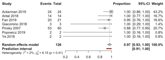 Seven studies were selected and combined using a random effects model with an inverse variance method. The root apex location success rate was stated at 96.8% with a confidence interval between 93.0% and 100% of the cases performed through a computer-aided static navigation technique (Figure 2). The prediction interval ranges from 91.4 to 100%. The meta-analysis did not detect heterogeneity between the combined studies (Q-test = 6.15; p-value = 0.407; I2 = 2.4%) (Figure 2).