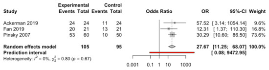 Three in vitro studies of computer-aided static navigation techniques and control group were compared using a random effects model with the Mantel-Haenszel method with a statistically significant OR of 27.7, with a 95% confidence interval between 11.3 and 68.1 (z test = 7.23; p < 0.0001). Root apex location success rate is 27 times higher using computer-aided static navigation techniques. No heterogeneity was detected (Q test = 0.80; p = 0.671; I2 = 0%) (Figure 3).