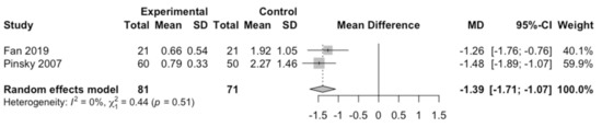 Combining two studies using a random effects model with the inverse variance method that measured apex measurement error using a computer-aided static navigation technique with respect to the control group, statistically significant differences were estimated (z test = −8.53; p < 0.0001) estimated at −1.39 mm with a 95% confidence interval between −1.71 and −1.07. No heterogeneity was detected (Q test = 0.44; p = 0.508; I2 = 0%) (Figure 4).
