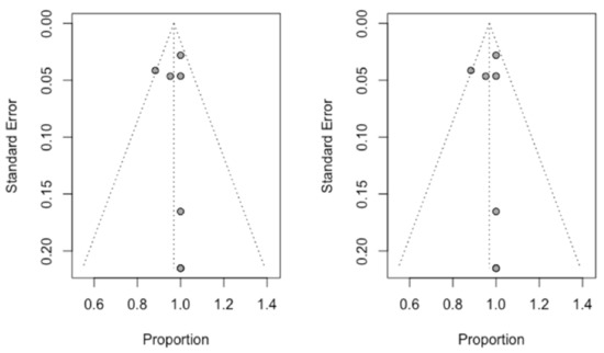 Used to assess publication bias, the trim and fill method was used to adjust the asymmetry of the funnel plot. No new studies were added to the seven initially combined to obtain a symmetrical image and the estimation of root apex location success rate was not varied, being 96.8% (95% CI between 93% and 100%). Figure 5 shows the two funnel plots (initial and adjusted), indicating a clear absence of publication bias.