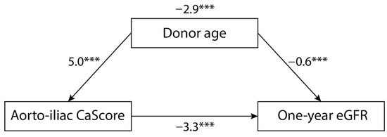 Graphical illustration of the magnitude of confounding for one-year estimated glomerular filtration rate (eGFR), showing the regression coefficients for the associations (*** indicating a p-value < 0.0001). The direct effect of the aorto-iliac CaScore on one-year eGFR was −3.3 (95%CI −5.1 to −1.5) and the effect on the confounder (donor age) was 5.0 (95%CI 3.8 to 6.2). The direct effect of the confounder on one-year eGFR was −0.6 (95%CI −0.7 to −0.5), with a bootstrapped indirect effect of −2.9 (95% CI −4.0 to −1.9).