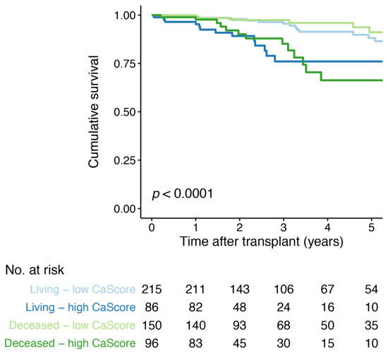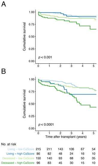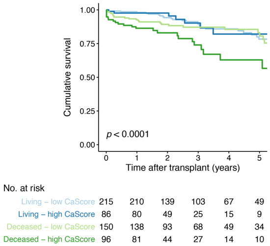 A total of 54 (9.9%) events of death with a functioning graft occurred, with 31 (17.0%) in the high and 23 (6.3%) in the low CaScore group (Table 2). Kaplan–Meier survival analysis for death with a functioning graft, with the low and high CaScore group stratified by living and deceased donor kidney transplantation, showed earlier graft failure for the living and deceased donor—high CaScore groups (p < 0.0001) (Figure 3). Kaplan-Meier survival analysis stratified by transplant recipient age showed, a lower survival for the recipients ≥65 years-of-age—high CaScore group (p < 0.0001) (Figure S4). In Cox regression analysis, a significant association was observed for a high CaScore and death with a functioning graft after adjusting for patient and transplantation covariables, including recipient and donor age (model 4, HR 2.7 (95% CI 1.4 to 5.0, p = 0.224)) (Table 4). When stratifying for donor status, the association remained significant for both living- and deceased-donation (model 4, p = 0.015 and p = 0.042, respectively) (Table S4).