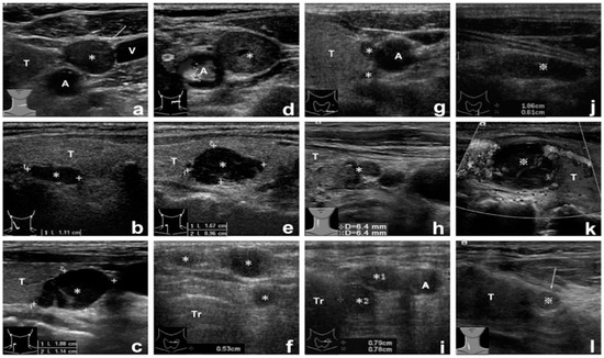 Images of positive and suspicious parathyroid sonography lesions. (a–c) Case 1, 2, 6, with positive sonographic lesions. (d) Case 5, with suspicious left upper neck lesion. (e) Case 20, with suspicious intrathyroid lesion. (f) Case 24, with suspicious multiple subcutaneous lesions. (g) Case 25, with suspicious dumbbell shape lesion. (h) Case 8, with suspicious infrathyroid lobulated lesion. (i) Case 26-1, with suspicious multiple paratracheal lesions. (j) Case 14, with suspicious intrathymus lesion (false assay-negative). (k) Case 31, with suspicious intrathyroid lesion. (l) Case 26-2, with suspicious infrathyroid small lesion. ✻ Positive tissue aspirate PTH assay lesions. ※ Negative tissue aspirate PTH assay lesions. Demographic data of enrolled patients are listed in Table S1. Abbreviations: A, common carotid artery; V, internal jugular vein; T, thyroid; Tr, trachea.