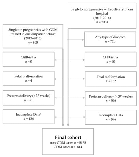Cohort composition: The final cohort consists out of 614 gestational diabetes (GDM) cases and 5175 non-GDM term deliveries. The non-GDM cohort was derived from initially 7033 singleton mother infant dyads from 2012 until 2016. All cases of stillbirths, fetal malformations, preterm deliveries (<37 weeks) and cases with incomplete data were excluded in both groups. All types of diabetes cases were excluded in the non-GDM group. 1 Higher rate of exclusions due to missing information about deliveries ex muros.