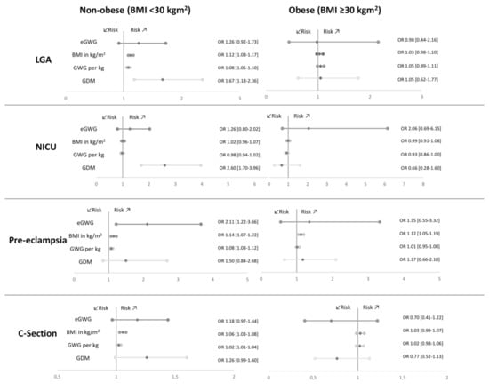 Adjusted odds ratios (ORs) of perinatal complications for the non-obese and obese subgroups: large for gestational age (LGA), neonatal intensive care unit (NICU) admission, pre-eclampsia and C-Section. Results from the logistic regression models adjusted for maternal age, parity, gestational age and sex of the newborn are presented: excessive gestational weight gain (eGWG), body mass index (BMI), gestational weight gain (GWG) per kg and gestational diabetes (GDM).