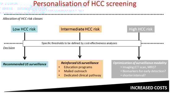 However, implementing these new tools into surveillance programmes may not be cost-effective for all patients, particularly for those who have achieved HCV clearance or HBV control, in whom decreased annual HCC incidences are now well established []. In this context, highlighting patients with a particularly low HCC incidence while reinforcing screening programs in those who remain at higher risk are of paramount importance to trigger personalized management. The intensification of HCC surveillance programs in high-risk groups is indeed a timely challenge as it would not only improve compliance [], which has been shown to increase access to HCC curative treatment and to improve overall survival in patients with viral cirrhosis [], but would also overcome the pitfalls related to the low sensitivity of US examination []. For example, the use of an expensive but highly sensitive imaging technique such as MRI, which is able to detect small liver lesions, could be justified in populations with the highest risk of liver cancer [] despite viral clearance or control, as reported by cost-effectiveness analyses performed in Asian patients infected with HBV with an annual HCC incidence above 3% []. Figure 1 shows a draft proposal for the potential application of HCC risk stratification in the setting of future personalized management in a way that might optimize the allocation of medical resources in a cost-effective fashion []. Achieving this goal will require the performance of dedicated studies in patients who have been stratified according to HCC risk; the definition of the optimal thresholds for allocation of patients into specific risk classes will depend upon the reported incidence of liver cancer following the successful implementation of antiviral therapy.