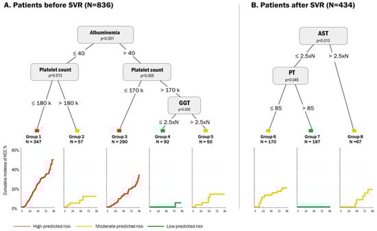Until recently, the stratification of HCC risk has been based only on simple scoring systems that combine routine clinical features without considering if these variable might operate in combination or independently [,]. In this context, more sophisticated approaches using machine learning approaches may in the future provide usable guidance for clinical practice []. This was recently applied to patients infected with HCV in whom risk was studied as a function of viral clearance. For instance, in the aforementioned ANRS CO12 CirVir cohort, which included cirrhotic patients during both the interferon era and the DAA era, machine learning approaches using decision tree analysis and random forest were applied to refine individualized predictions of HCC risk []. As expected, the clinical features associated with HCC differed in patients without SVR (past excessive alcohol intake, HCV genotype 1, platelet count, gamma glutamyltransferase (GGT), alpha-fetoprotein and albumin) and following SVR; prothrombin time and aspartate aminotransferase were predictors after SVR. The decision tree analysis revealed unsuspected interactions between variables and stratified patients in these two distinct clinical situations into 8 different phenotypes with different cancer risks (see Figure 2). In particular, SVR patients could be classified as having low or moderate HCC risk according to these simple biological parameters. Similarly, deep learning models were recently applied to data in the VA database []. In this context, use of a recurrent neural network (RNN) outperformed conventional models in identifying patients with the highest HCC risk regardless of their SVR status.