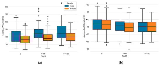 Comparing EATvol and EATatt between CACS categories and gender groups. (a) EAT volume increases significantly between CACS 0 vs. CACS 1–99 in women and men. No significance between CACS 1–99 vs. CACS ≥100 for both sexes. (b) EAT attenuation increases significantly between CACS 0 vs. CACS 1–99 in women, but not in men. No significance between CACS 1–99 vs. CACS ≥100 for both sexes (see Table 3).