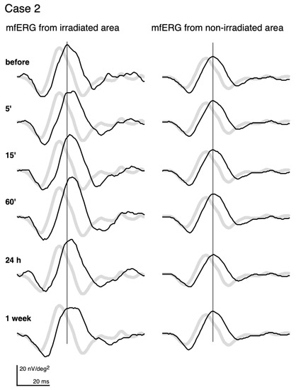 The mfERGs recorded from the irradiated area (left column) and those from a non-irradiated area (right column) of the same eye of Case 2 are shown in Figure 2. The pale waveforms represent the average responses in the corresponding locations of the irradiated and non-irradiated areas of normative mfERGs.