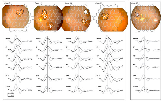 The mfERGs recorded from Cases 3, 12, 14, and 15 are shown in the left panel of Figure 3. They demonstrate the same pattern of changes after the PC as Case 2 in Figure 2.