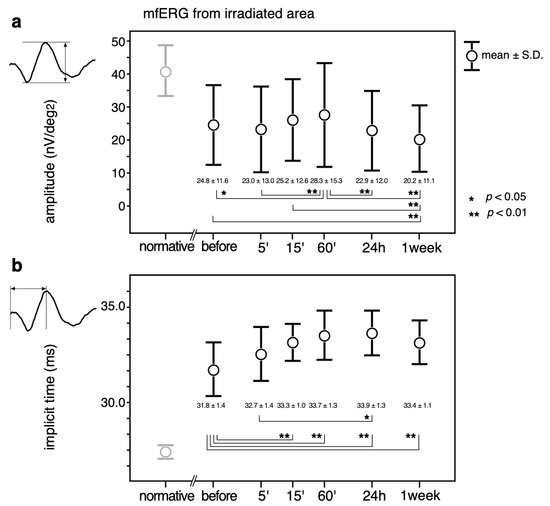 The mean ± standard deviations over the time course of the changes in the amplitudes are shown in the upper panel (a) in Figure 4. The implicit times (Figure 4, b) of the mfERGs recorded from the irradiated area are also shown.