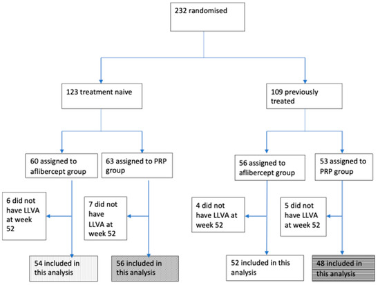 Flow chart of participants in this study. PRP: pan-retinal photocoagulation. LLVA: low luminance visual acuity.
