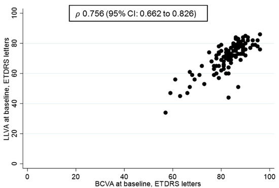 The correlations between BCVA and LLVA in treatment naïve eyes are shown in Figure 2. These visual functions are highly correlated although more variations were observed with LLVA in lower levels of BCVA.