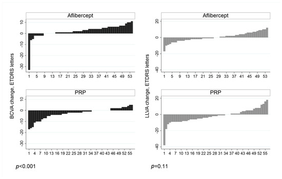 The individual patient-level response to treatment with aflibercept and PRP in treatment-naïve eyes is shown in Figure 3. When we compared the response between treatment arms, BCVA change was found to be statistically significant (p < 0.001) but LLVA was not (p = 0.11). The mean change in LLD between treatment arms in treatment naïve eyes did not reach statistical significance (p = 0.06; independent t-test).