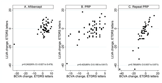 3.3. Correlation between Mean Change in BCVA and LLVA in the Three Treatment Groups