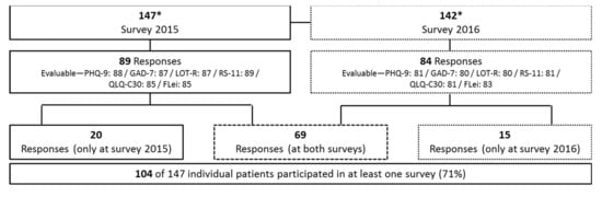 From June 2015 until July 2016, 147 patients with an acquired TTP that was diagnosed prior to starting this study were asked to participate. Between the 2015 and 2016 surveys, five of the 147 participants were lost to follow-up. Accordingly, 142 TTP patients were sent the questionnaires in the 2016 survey, about one year after the first inquiry. We received 89 responses in the 2015 survey, with 89 of those being evaluable for RS-11, 88 for PHQ-9, 87 for GAD-7 and LOT-R and 85 for FLei (Figure 1). Eighty-four responses were obtained in the 2016 survey, with 83 of those being evaluable for Flei, 81 for PHQ-9, RS-11 and QLQ-C30 and 80 for GAD-7 and LOT-R (Figure 1).