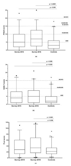 In 2016, 37 (46.3%) of 80 iTTP patients had no symptoms of anxiety, whereas 29 (36.3%) patients had mild anxiety (score 5–9), 11 (13.8%) had moderate anxiety (score 10–14) and three (3.8%) had severe anxiety (score 15–21). The median evaluated score was 5 (IQR 1–9), ranging from 0 to 21 (Figure 2b). Ninety-five of the 132 controls (72.0%) did not show any symptoms of anxiety (Figure 2b). The prevalence of anxiety disorders in the overall iTTP cohort was higher in both surveys (2015 p < 0.035; 2016 p < 0.008) than in the control group (Figure 2b). In particular, the proportion of clinically relevant anxiety disorders (score ≥ 10) in the iTTP cohort was significantly higher in 2015 (19.5%) and in 2016 (17.6%) than in the control group (8.4%).