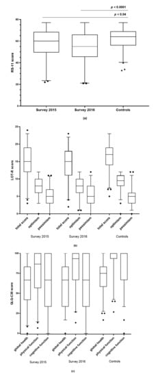 The questionnaire on the attitude to life (LOT-R) was answered by 87 patients in 2015 and 80 patients in 2016. The results in the categories of optimism, pessimism and the total score could be compared with 134 control persons. In the first survey, no significant difference (p = 0.088) between the patients (median 15, IQR 12–19) and controls (median 17, IQR 14–19) was found in the total score, but in the second survey, a significant difference (p = 0.009) between the patients (median 17, IQR 11–18) and controls was found (Figure 3b). In the optimism score, the patients showed significantly worse results than the control group in both rounds (2015 survey p = 0.011, 2016 survey p = 0.006) (Figure 3b). Within the pessimism score, no large differences between the patients and controls could be detected (2015 survey p = 0.49, 2016 survey p = 0.63) (Figure 3b).