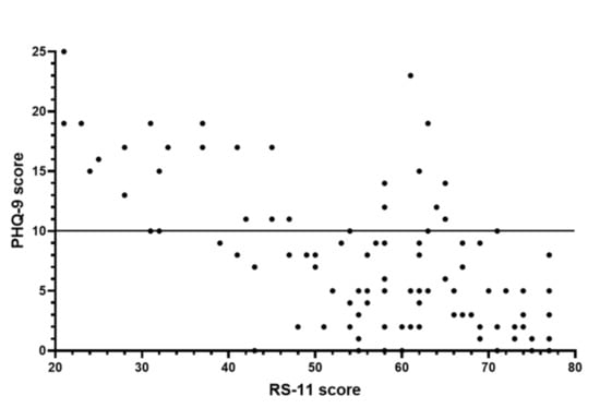 Correlation of the PHQ-9 score (depressive symptoms) with the resilience score. The correlation of the degree of depression (PHQ-9) with resilience (RS-11) was analysed for 102 iTTP patients (rs = −0.588, p < 0.0001) (every iTTP patient was analysed only once, the first evaluation of those that participated in both surveys was considered). The horizontal line indicates the cut-off for major depression (PHQ-9 score ≥10).