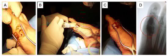 When this study was conducted, no uniform treatment protocol existed for the surgical treatment of DFO with gentamicin-loaded CaS-HA biocomposite. The surgical procedures with gentamicin-loaded CaS-HA biocomposite generally consisted of the following steps: After excision of one or more foot ulcers, macroscopic necrotic bone and necrotic and infected soft tissues were resected (Figure 1A). In most cases, surgeons obtained one or more bone samples for examination of microbiological pathogens. The remaining dead space was irrigated with saline solution and filled with CaS-HA biocomposite loaded with gentamicin (17.5 mg/mL) via injection or as pellets (Figure 1B,C). Guidance using x-ray imaging was used at the surgeons’ discretion.