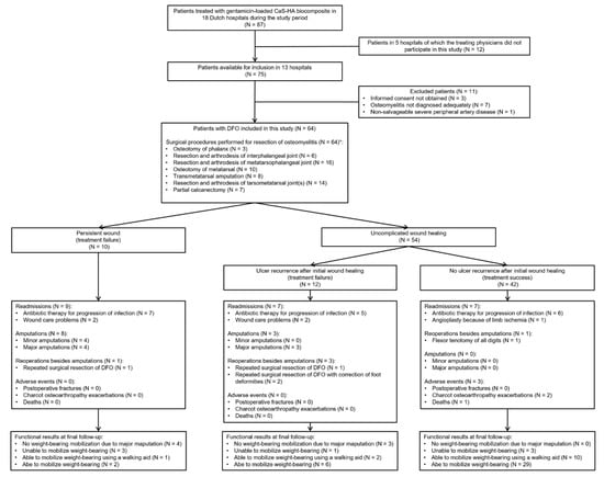 Our study has several limitations. First, the retrospective design imposes a risk of bias. Second, the absence of current protocols for the surgical procedures and postoperative treatments resulted in a heterogeneous study population. Even though we included almost all patients treated with gentamicin-loaded CaS-HA biocomposite, and therefore obtained a representative study population for current clinical practice in the Netherlands, the resulting heterogeneity introduces various confounding factors which limit the conclusions that can be drawn. Third, the included study population was relatively small. Even though it is larger than in most previous studies, the small study population increases statistical errors. Therefore, the analyses performed should be considered exploratory and be interpreted cautiously. Fourth, our study is limited by the lack of a control group. In future prospective studies, a uniformed treatment regimen should be compared to a control cohort of patients treated by conventional treatments. Fifth, adequate investigation of ulcer recurrence was limited by the median follow-up of 43 weeks, which should ideally be 12 or 18 months after initial wound healing for this purpose []. Sixth, specific information regarding diabetes mellitus (i.e., glycemic control) and other risk factors for vascular disease (e.g., dyslipidemia or smoking status) was lacking, as well as details regarding the preoperative discontinuation of antibiotic therapy and the number and exact sites where bone samples were obtained. Seventh, we did not include a minimal postoperative duration in the definition of persistent wounds, which should be considered in further prospective studies. Eight, pre-operative functional status was not investigated in the assessment of functional results. Finally, assessment of persistent or recurrent osteomyelitis in patients with treatment failures was not possible, since additional investigations (e.g., imaging, bone samples) were not performed consistently. Future prospective studies will overcome these limitations.