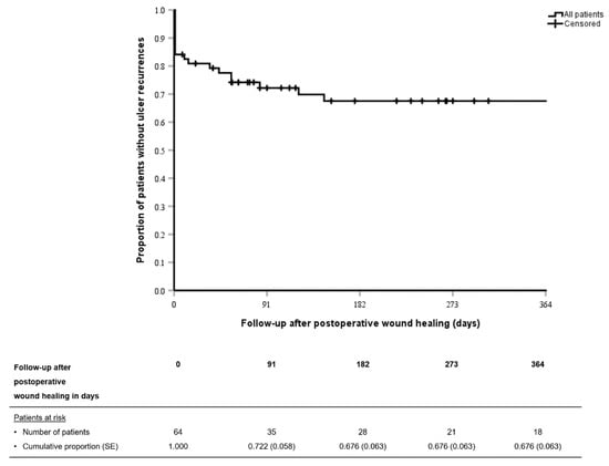 Postoperative antibiotic therapy was administered in 26 patients (41%) for a median of 3 (IQR, 2–6) weeks. Postoperative antibiotic therapy was administered to four patients (40%) without postoperative wound healing, which was not significantly (p = 0.930) different from patients with ulcer recurrence (n = 4 (33%)) or without ulcer recurrence (n = 18 (43%)). Postoperative offloading was performed in all patients for median 6 (IQR, 5–8) weeks by non-weight-bearing mobilization (n = 33 (52%)), nonremovable knee-high devices (n = 14 (22%)), removable knee-high devices (n = 2 (3%)) and removable ankle-high devices (n = 15 (3%)).