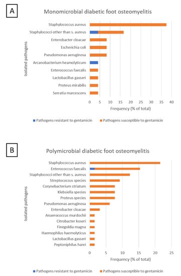 Pathogens isolated in bone samples of 49 patients with diabetic foot ulcers complicated by osteomyelitis. (A) Distribution of pathogens isolated in 16 patients with monomicrobial osteomyelitis. (B) Distribution of 87 pathogens isolated in 33 patients with polymicrobial osteomyelitis. Gentamicin-resistance of pathogens was based on the minimal inhibitory concentration breakpoints of the European Committee on Antimicrobial Sensitivity Testing (EUCAST).