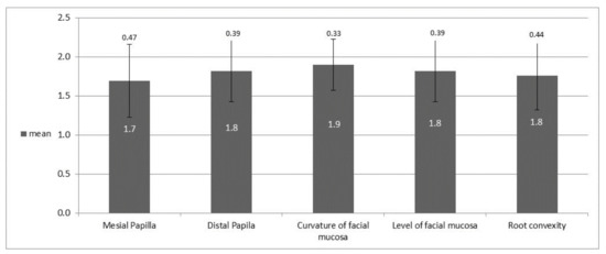 The total average value of the PES index was 9.0 ± 1.79 (range 5–10). In addition, relatively similar and high results were found in all the parameters examined (Figure 1); mesial papillae (1.7 ± 0.47), distal papillae (1.8 ± 0.39), buccal gum contour curvature (1.9 ± 0.33), buccal gum height (1.8 ± 0.39), root/color curvature and soft tissue texture in the buccal aspect of the implant site (1.8 ± 0.44). The minimum threshold value defined as clinically acceptable for the PES or WES index is 6 [15]. In 29/33 implant sites (87.87%), PES values were obtained above the minimum threshold value, which generally indicates a good esthetic result.