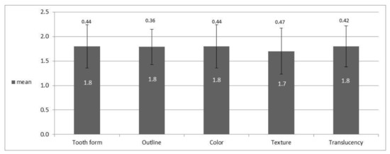 The mean value of the WES index was (8.8 ± 1.84) with a range of 5–10. Also, relatively similar results were found in the parameters examined (Figure 2); the original tooth shape (1.8 ± 0.44), outline and volume of the clinical crown (1.8 ± 0.36), color including the evaluation of hue and value indices (1.8 ± 0.44), surface texture (1.7 ± 0.47), transparency and characterization (1.8 ± 0.42). A total of 30/33 crowns tested (90.9%) received a total WES value above 6, which is the clinically acceptable threshold value.