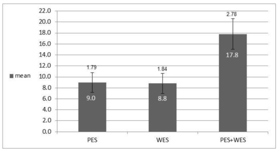 In the combined esthetic results analysis, according to the PES and WES indices (Figure 3, Figure 4 and Figure 5), it was found that the total PES average (9.0 ± 1.79) was higher than the average of the overall WES index (8.8 ± 1.84) and that the weighted average of both was 17.8 ± 2.78.
