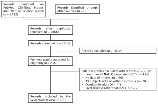 In total, 3432 papers were found: 969 on PubMed, 137 on CENTRAL, 1429 on Scopus and 897 on Web of Science. After the removal of 1564 duplicates, 1868 articles were analyzed for the title and abstract; 1630 records were excluded (meta-analysis, review, all subjects with or without cirrhosis, less than 50 NAFLD-associated HCC, poster, editorial, letter, outside the scope of the review). The remaining 238 papers were retrieved in full-text and 30 articles were finally included in the meta-analysis (Figure 1) [,,,,,,,,,,,,,,,,,,,,,,,,,,,,,]. No additional studies were retrieved from the references of the included studies.