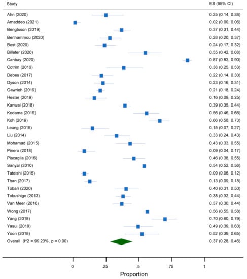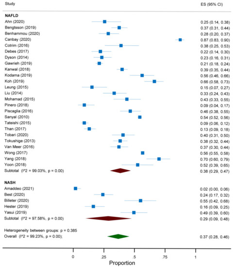 The natural history of NAFLD is generally characterized by the progression from simple steatosis to inflammation (non-alcoholic steatohepatitis (NASH)) and subsequent fibrosis, cirrhosis and hepatocellular carcinoma (HCC). Subjects with cirrhosis carry the highest risk of adverse clinical outcomes, including end-stage liver disease, esophageal varices and HCC. Therefore, current guidelines recommend that these patients be entered into surveillance programs []. Conversely, they do not support routine surveillance for HCC in patients with non-cirrhotic NAFLD, since the individual risk of the progression of these subjects is considered lower [,]. However, surveillance programs allow for the detection of HCC at an early stage and an increasing number of patients suffering from NAFLD-associated HCC in the absence of cirrhosis has been reported []. It is not clear whether guidelines have accounted for this issue []. The aim of the present meta-analysis was to achieve solid information on the prevalence or absence of cirrhosis in subjects with NAFLD-associated HCC.