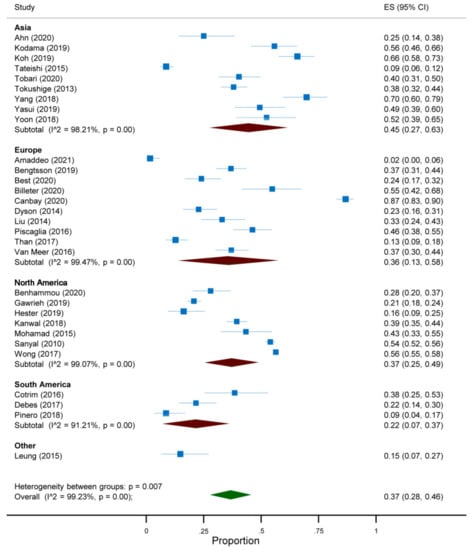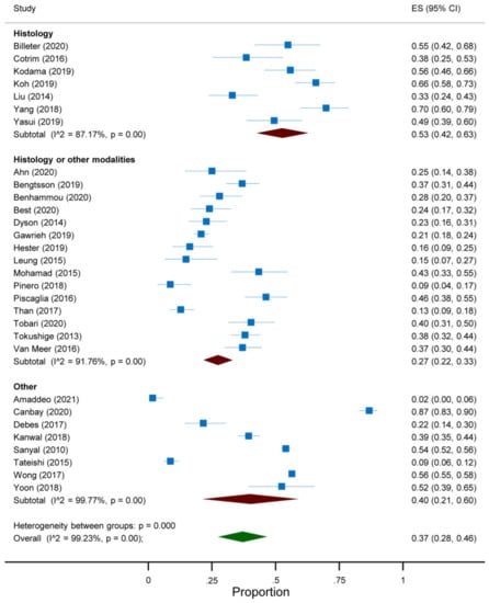 Traditionally, the natural history of NAFLD has been considered as a continuum from simple steatosis to inflammation, fibrosis, cirrhosis and its complications, including HCC []. However, evidence accumulating in recent years has shown that the pathogenesis of NAFLD-associated HCC may differ from this pathway in some subjects. In particular, a meta-analysis published by Stine et al. showed two-fold higher odds of developing HCC among subjects with non-cirrhotic NASH compared to subjects with other liver disease etiologies (OR 2.61, 95% CI 1.27 to 5.35, p = 0.009) []. In line with this result, we found that about one in three subjects with NAFLD-associated HCC had no cirrhosis at the cancer diagnosis. The prevalence appeared to be higher in Asia versus Europe, North America and South America, as well as in studies adopting histology only as the reference standard for the diagnosis of cirrhosis compared to other modalities. No difference was found among the studies including subjects with NAFLD with or without NASH compared to NASH only. Ethnicity may be the basis for the geographical finding; indeed, it is common knowledge that Asians are characterized by a higher prevalence of NAFLD and a more severe inflammation at biopsy []. Additionally, a higher prevalence of previous or occult HBV infection and carriage of the PNPLA3 polymorphism, both associated with an increased risk of HCC, has been reported in these subjects []. Concerning the reference standard for the diagnosis of cirrhosis, the performance of imaging is generally adequate and the same holds true for the other modalities (e.g., evidence of portal hypertension) []. Moreover, even if histology is generally considered the gold standard, it may be contraindicated in some subjects (e.g., patients with hepatic decompensation would unlikely have histology and, therefore, be underrepresented in such cohorts) and/or associated with sampling variability/inadequate biopsy samples leading to discordant results. Therefore, our finding of a lower prevalence of non-cirrhotic NAFLD-associated HCC in subjects whose liver was assessed by histology, radiology, endoscopy, biochemistry or overt clinical findings as compared to histology only, should not be interpreted as a different diagnostic accuracy of adopted methods. Rather, it may be viewed as a consequence of the different study design leading to a different selection bias, suggesting that the former studies provide a more reliable estimate. Finally, patients with end-stage liver disease might have burnt-out NASH, and the histologic features of necroinflammation might no longer be apparent; the absence of NASH at the time of HCC diagnosis does not mean that the patient has never had NASH before. Therefore, our findings on differences in the background liver disease should critically be interpreted.